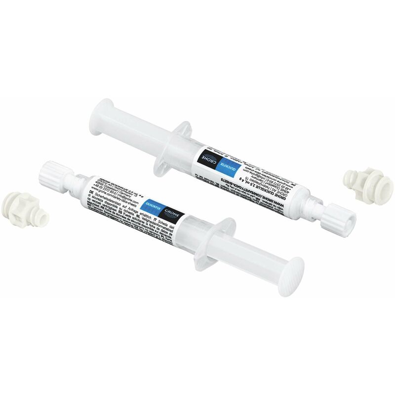 Colla QuickFlue QuickGlue A2 adatto per fissare piccoli accessori da bagno volume: 2,5 ml 2 pezzi nella confezione (2 siringhe con colla e 2 adattatori) indurire: 24 ore adatto per piastrelle, marmo, pietra, vetro, cemento, legno, plastica e metallo non adatto per carta da parati, intonaco e materie plastiche come PE, PTFE, PP Questo prodotto contiene componenti dichiarati come sostanze pericolose. Ulteriori informazioni sono disponibili su: www.grohe.com/safety-data-sheets