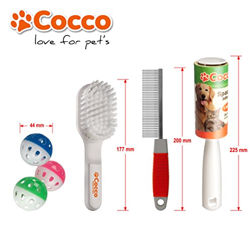 Set accessori per il gatto. Spazzola, pettine, 3 giochi e spazzola adesiva per togliere i peli da divani e tappeti.