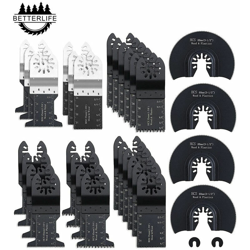 Hanno denti lunghi e ondulati. Appositamente progettati per un taglio più rapido e pulito di legno e plastica. Ogni confezione contiene 30 diversi tipi di lame per sega per il taglio di legno, metallo, plastica e altri materiali. Il tipo di lama per sega è specifico per un'applicazione specifica. Le nostre lame per seghe oscillanti possono soddisfare una varietà di esigenze sia in officina, a casa o in qualsiasi altro luogo. Elenco delle parti del kit da 32 pezzi: 6 lame per sega a denti fini ad alto tenore di carbonio da 34 mm in carbonio, 6 lame a denti grossi da