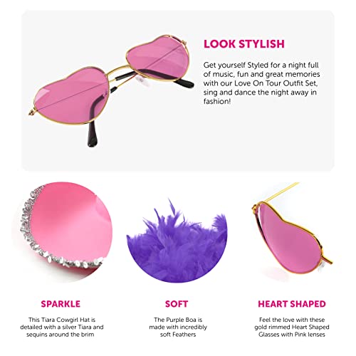 Il set di costumi include: questo set di costumi Love On Tour include un cappello da cowboy rosa con un design a diadema d'argento sul davanti e una corda regolabile, un morbido boa di piume viola e un paio di occhiali a forma di cuore con lenti rosa!
