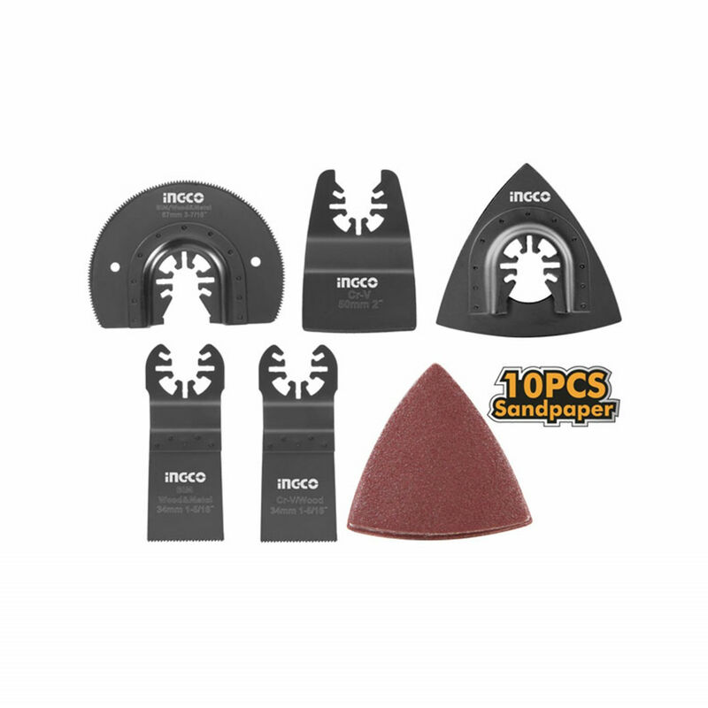 Set 15 pezzi composto da: 1 lama a segmenti Ø 87 mm 1 lama a delta, 80 mm 1 lama per legno radiale a filo 34mm 1 lama bi-metallo standard a filo 34 mm 1 Raschietto rigido dimensioni: 50mm 10 Carta vetrata a delta ossido di alluminio 80 mm