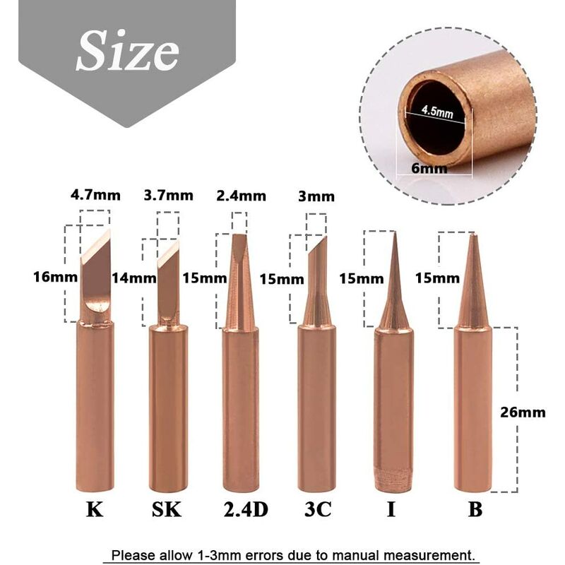 dimensioni: diametro esterno 6 mm, diametro interno 4,5 mm 1 set di punte per saldatore, 6 forme diverse: 900M-T-B, 900M-T-I, 900M-T-K, 900M-T-SK, 900M-T-2.4D, 900M-T-3C (set di 6)< /p> Le punte in rame con messa a terra di precisione sono in ferro, nichel e cromate, le punte 900M hanno una lunga durata e possono utilizzare fino a 40.000 giunti di saldatura. Facile da usare, riscaldamento rapido della base in rame, buona proprietà di sospensione dello stagno, non facile da ossidare. Adatto per tavoli saldatori 936, 937, 938, 969, 900M, 8586, 852D. Ampia gamma di applicazioni: adatto per Hakko, Radio Shack 64-053, Atten, Quick, Aoyue, Yihua, X-Tronic, Vastar, Sywon, Tabiger, SOAIY, SEALODY e altre stazioni ferroviarie di marca. attenzione! - Utilizzare la punta del saldatore entro il normale intervallo di temperatura e provare a utilizzare la saldatura a bassa temperatura per prolungare la durata della punta del