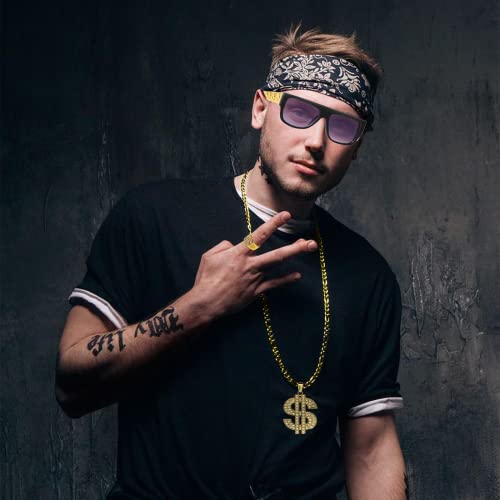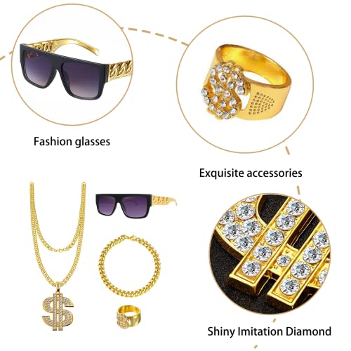 【Il pacchetto comprende】4 pezzi Costume Hip Hop, 1 collana a catena d'oro con segno del dollaro hip hop, 1 anello d'oro con segno del dollaro hip hop, 1 occhiale da sole oversize da rapper, 1 braccialetto a catena d'oro.