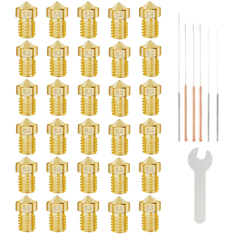 Caratteristiche: Cosa ottieni: 6 diverse dimensioni di ugello: 0,2 mm, 0,3 mm, 0,4 mm, 0,6 mm, 0,8 mm, 1,0 mm, ciascuno con 5 pezzi, 6 aghi per la pulizia e una chiave. ✔ Compatibile con stampante 3D Ender 2/3/5, Makerbot Creality CR-10, ecc. Adatto a tutti i filamenti da 1,75 mm come la stampante 3D PLA ABS. ✔ Tecnica squisita della parete interna, basso coefficiente di viscosità, l'alimentazione del filamento è più liscia. ✔ Realizzato in ottone di alta qualità, durevole, resistente all'usura e anticorrosione. ✔ Gli aghi di pulizia da 5 pezzi hanno 5 diverse dimensioni: 0,2 mm, 0,3 mm, 0,4 mm, 0,6 mm, 0,8 mm e 1,0 mm, adatti per pulire la maggior parte degli ugelli della stampante 3D. Specifica: Tipo di elemento: ugello Materiale: ottone Filamento: 1,75 mm Dimensioni ugello: 0,2 mm, 0,3 mm, 0,4 mm, 0,6 mm, 0,8 mm, 1,0 mm (ogni misura 5 pezzi) Lista imballaggio: 30 ugelli 1 x chiave inglese 6 x ago
