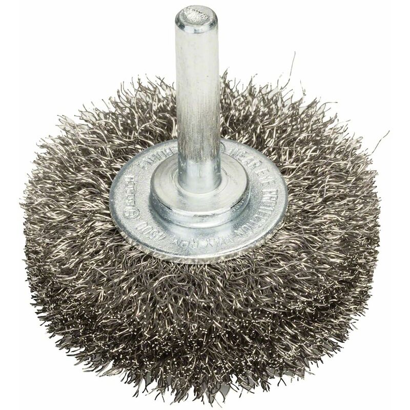 Spazzola a disco con gambo da 6 mm, spazzola in acciaio inossidabile per trapani, filo ondulato, spessore filo: 0.2 mm, diametro spazzola: 50 mm, larghezza spazzola: 15 mm, velocità, max. min-1: 4500 giri/min, ideale per rimuovere Ricottura colore per saldature su acciaio inossidabile, adatto per lavori di pulizia da leggeri a medi su piccole aree, in scanalature o su bordi su acciaio inossidabile, alluminio o metalli non ferrosi, come rimozione della ruggine, irruvidimento, opacizzazione, sverniciatura, strutturazione.