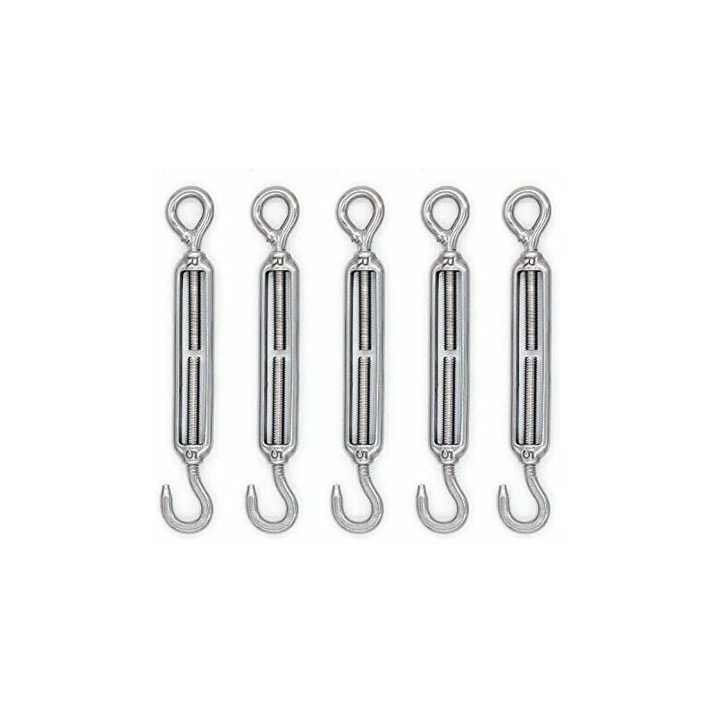 Materiale: realizzato in acciaio inossidabile 304 di alta qualità, resistente alla ruggine e durevole. Molteplici usi: eccellente per regolare la tensione o la lunghezza di cavi, funi, aste dello sterzo e altri sistemi di tensione. Ampiamente usato per uso interno ed esterno. Peso: 200 g. Dimensioni: M5 Contenuto della confezione: 5 ganci tendifilo Facile da usare: basta ruotarlo per regolare la tensione quando lo si indossa. o altre applicazioni.