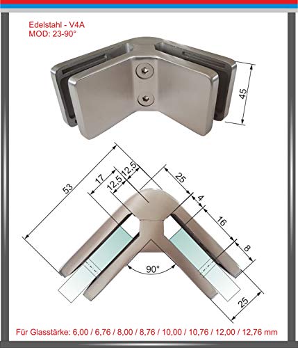 PMC Acciaio inox V4A MOD:23 Supporto per vetro, morsetto in vetro, morsetto in acciaio inox 90°, forma angolare, tutti (10,00 mm)