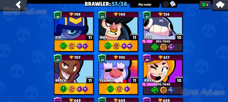 Vendo per inutilizzo account di Brawl stars: 57/58 brawler ottenuti, tutti lv9 o più; 31 mila trofei; oltre 40 skin; 45k monete stellari; 5k oro; 300 gemme