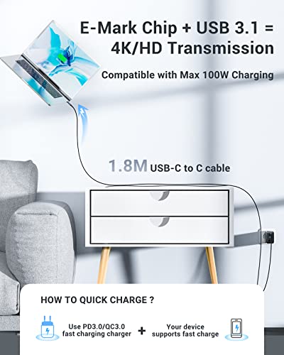 Caricatore Veloce GaN: Lettura dati porta USB-C/A,Risparmio tempo.Forniamo cavo 100W DA USB C-C 1.8M,Porta USB-C con ricarica rapida fino a 60W e funzione di trasmissione dati 10 Gbps con protocollo USB-C 3.1. USB-A ha una velocità di trasmissione del protocollo USB-C 3.0 di 5Gbps e ha la funzione di caricare o leggere un disco da 5W. Chip E-Mark integrato nel cavo, supporto per trasmissione dati USB 3.1 e ricarica rapida da 100 W, per le esigenze di utilizzo a lunga distanza.
