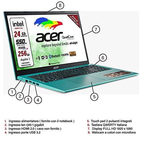 ✔️ ⚪ Notebook Acer versione dedicata certificata business partner Gold Acer Italia con Cpu Intel N 6000, 4 Core frequenza base 1,1GHz DI OGNI SINGOLA CPU in modalità burst mode FINO a 3,3 Ghz, scheda VIDEO intel ULTRAHD risoluzione Full HD 1920 x 1080 display 15,6 pollici FULL HD 1920 X1080, 24 gb di Ram DDR 4, SSD M2 pci NVMe da256 Gb, peso 1,77 Kg tastiera italiana QWERTY, 3 USB, WEBCAM, LAN, WIFI, BLUETOOTH, GARANZIA 2 anni, ASSISTENZA ITALIANA SEMPRE GARANTITA
