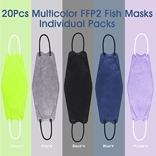 Acewin 20 Pezzi Mascherine FFP2 Certificate CE Colorate, Mix 5 Colori Nere, Blu, Grigio, Viola, Verdi, FFP2 Mascherina Adulti di Protezione a 4 Strati Maschere Monouso, Sigillate Singolarmente