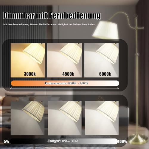 【Dati dettagliati】Stile retrò, lampada da terra salotto Telecomando dimmerabile, 3000K-6000K, Angolo di illuminazione regolabile, Paralume in tessuto, lampada da salotto Con base in metallo e interruttore a pedale, 12W 960LM