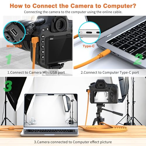 Questo Cavo è Progettato per collegare la fotocamera DSLR al computer e filmare in tempo reale. È adatto solo per computer con interfaccia USB-C e fotocamera con interfaccia Mini USB, altre interfacce non sono compatibili! Controllare l'interfaccia della fotocamera e del computer prima dell'acquisto. È possibile trasferire foto e video su PC, laptop o tablet.
