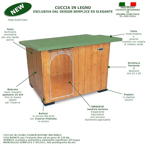 Le cucce Original Legno Italia sono costruite artigianalmente in robusto legno massello spessore 15 mm pino Svezia di prima qualità, adatto per l'esterno. Cuccia in legno Italy con Davanzale La cuccia e davanzale poggiano su piedoni in materiale plastico che proteggono dall'umidità tutta la struttura. Bulloni in acciaio MA 6×35 con Inserto Filettato metrico in acciaio. L'ingresso è dotato di bordature protettive in alluminio anti morso.