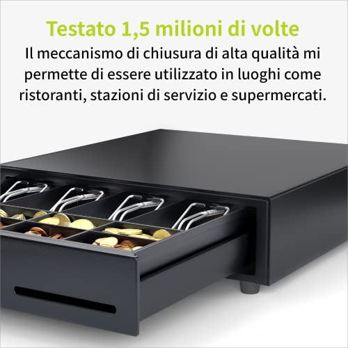 Cassetto cassa manuale - Apri manualmente il cassetto per contanti premendo l'apposito pulsante. Non è richiesta elettricità. Testato per almeno 1,5 milioni di aperture!