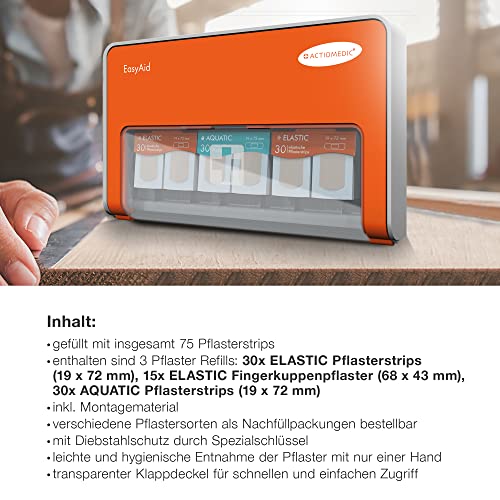 ACTIOMEDIC I EasyAid Standard II distributore di cerotti, Include 75 pz cerotto, Con sistema Kanban e accessori montaggio a parete, Arancione