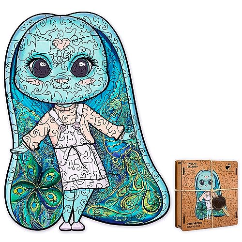 Caratteristiche: il puzzle del coniglio Pigly misura 16 x 21 cm e pesa 64 grammi, una volta finito. È composto da 105 pezzi a forma di coniglio, aquila, cappello a coppa e trifoglio tra gli altri. I colori utilizzati sono verdi. Il puzzle viene fornito in una scatola di legno con l'immagine sul davanti e la confezione misura 15,5 x 16 x 4,5 cm e pesa 340 grammi. La dimensione del puzzle è superiore alla media offerta da altri produttori. Questo puzzle fa parte della nostra collezione per bambini.