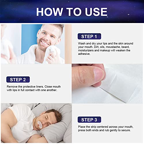 ✅【USO EFFICACE】Chiudi le labbra e posiziona il nastro tra le labbra. Chiudere la bocca durante il sonno può aiutare a ridurre la respirazione orale e il russamento. Per garantire che il nastro aderisca saldamente, non applicare creme, lozioni o balsami per labbra attorno alle labbra coperte dal nastro. Nota: utilizzare in base alle proprie condizioni fisiche.