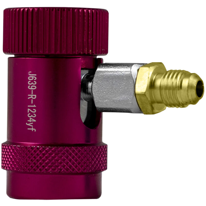 Adattatore per aria condizionata/refrigerante a collegamento rapido R1234YF. Rosso (alta pressione). Il design a connessione rapida consente una sicurezza completa. Con connessione che protegge da lesioni e perdita di refrigerante se scollegato sotto pressione. Utilizzo: AACC e refrigerante Materiale: ottone e metallo Colore: rosso, blu Dimensioni: altezza 55 mm, diametro 30 mm.