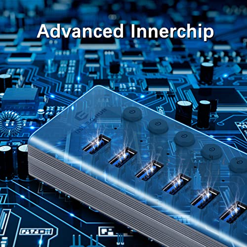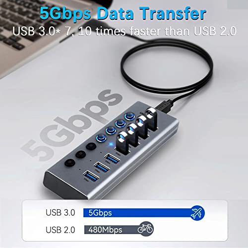 Hub USB 3.0, Adattatore USB 7 in 1 con Attivo 3.0 Alimentatore, Alluminio Hub USB 3.0 con 7 porte USB-A cavo da 100 cm, Alimentatore da 24 W (12V/2A) e Interruttore Separato con Indicatore LED