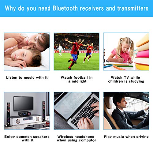 Trasmettitore ricevitore Bluetooth 2 in 1: girare a commutatore in posizione "RX" o "TX", il dispositivo funziona in modalità ricevitore wireless/trasmettitore. Versione Bluetooth 5.0, il segnale è più stabile e la qualità del suono è più piacevole.