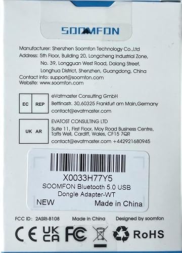 【Adattatore Bluetooth 5.0 Aggiornato - Prestazioni Migliori】 L'adattatore Bluetooth SOOMFON adotta la tecnologia Bluetooth 5.0 aggiornata. Rispetto alla versione inferiore, la velocità di trasmissione dei dati è maggiore, fino a 3 Mbit/s, e la distanza di trasmissione è aumentata a 20 metri. Allo stesso tempo, il processo di trasmissione consuma meno energia, è più stabile e non perderà dati.