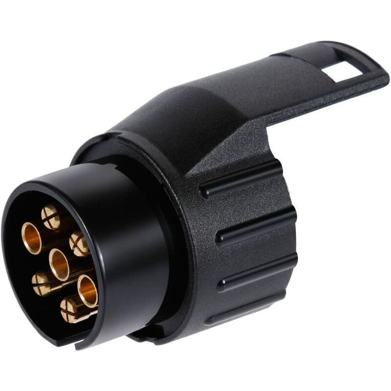 Progettato secondo il rimorchio adattato a 7 pin dei veicoli standard europei: stabilisce il collegamento stabile e sicuro tra un veicolo principale e il veicolo trainato e trasmette il segnale elettrico della lampada al rimorchio Adatto per La maggior parte delle auto ha una presa per gancio di traino a 7 pin e i rimorchi o i portabiciclette hanno prese a 13 pin? -da presa laterale veicolo ad una presa con attacco a 13 poli L'asta che si vede sporgere dal retro in foto permette il bloccaggio sulla presa laterale auto: il tappo a scomparsa della presa auto cade proprio dentro