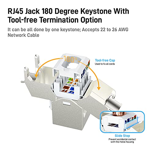 Questa giacca keystone CAT 7 autobloccante completamente schermata è priva di attrezzi ed è progettata per un facile montaggio a scatto per diversi accessori, come pannelli patch Keystone, scatole per montaggio superficiale o piastre a muro (piastre frontali)
