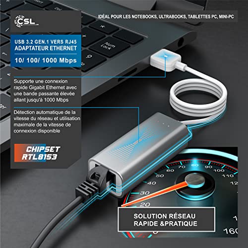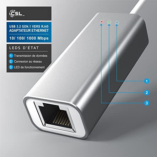 CSL - adattatore di rete da USB 3.0 a RJ45 Gigabit Ethernet (RJ45) esterno. Ethernet da 10/100/1.000 Mb/s. Supporta Mac OS X / Windows 10 / 8.1 / 8 / 7 / Vista / XP / Chrome OS. Colore: argento