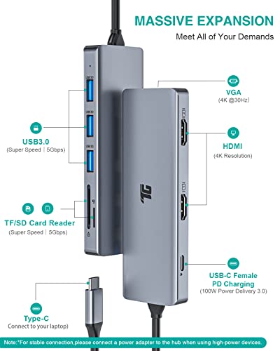 Ampia docking station per computer portatile tipo C: l'hub USB C 9 in 1 di livello include doppia 4k HDMI, VGA, PD 100w di ricarica, tre USB 3.0, lettore di schede TF e SD e offre un'incredibile comodità per collegare più monitor, dispositivi di memoria extra o dispositivi USB. 100% rimborsato per problemi di qualità entro 30 giorni, 12 mesi e servizio clienti cordiale.