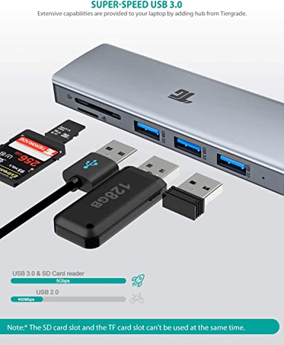 Sincronizzazione dati ad altissima velocità: tre porte USB 3.0 supportano velocità di trasmissione fino a 5 Gbps. Slot SD e TF integrati per un facile accesso ai file dalla scheda di memoria SD universale e Micro SD. È necessario un adattatore da parete per laptop alla porta USB-C Power Delivery prima di collegarsi a qualsiasi disco rigido esterno o a più dispositivi.