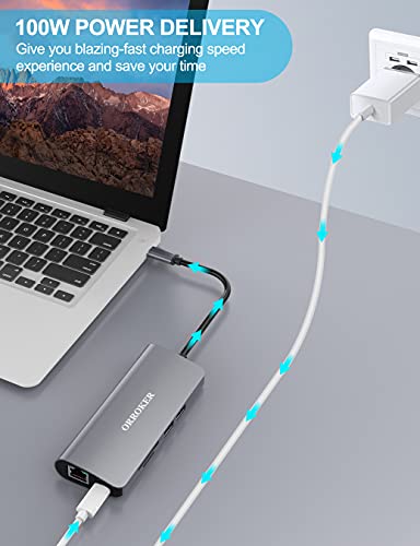 Power Delivery: Support PD charging at max 100W, This multiport USB C adapter provides one Type-C pass through Female port by which you could securely charge connected MacBook or other Type-C laptops.