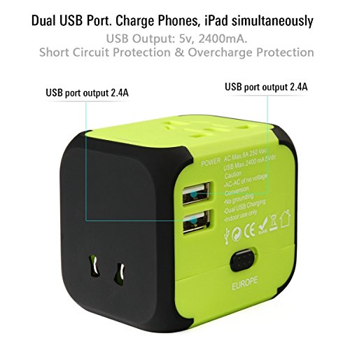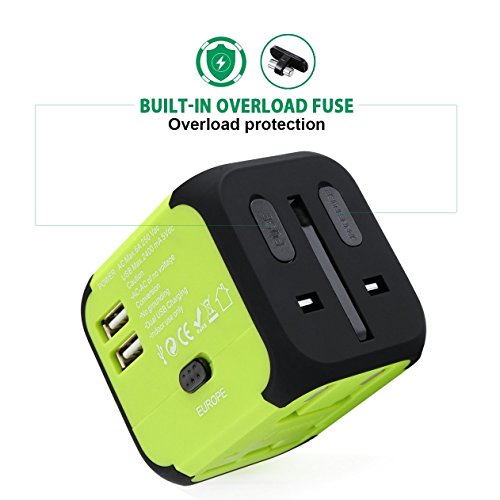 Adattatore Universale da Viaggio All-in-one Caricatore Adattatore per US UK AU EU Multi-nationale Spina da Parete Universale Adattatore do Alimentazione Caricatore con 2 USB e fusibile di sicurezza(Verde)