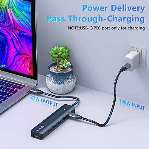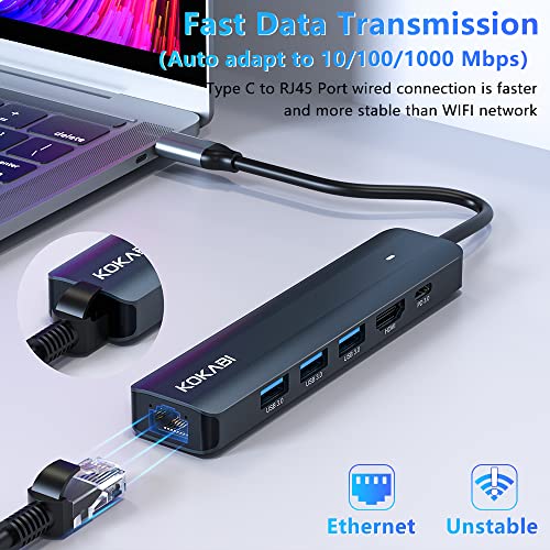 【6 in 1 adattatore hub USB C】 Hub tipo C trasforma la porta USB-C/Type-C/Thunderbolt 3 del notebook in un'uscita HDMI 4K@30Hz, una porta Lan Ethernet RJ45 da 1Gbps, 3 porte USB A 3.0 e una porta di ricarica USB-C PD da 100W. Plug and play senza necessità di installare driver. Tutte le porte consentono la connessione simultanea, soddisfano tutte le esigenze lavorative e aumentano efficienza del lavoro.