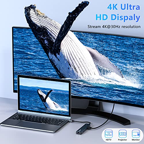 【Adattatore HDMI Ultra 4K HD】Hub USB C HDMI per macbook pro supporta alta risoluzione fino a 4K@30Hz (3840x2160) e lo streaming di video 4K o Full HD 1080p direttamente su HDTV, monitor o proiettore. Compatibile con 1080p@60Hz, comprese le risoluzioni 1080p, 1080i, 720p e 480p. Offre una vivida sincronizzazione video con effetto 3D. Tipo c hub Ideale per ufficio, intrattenimento e le riunioni.
