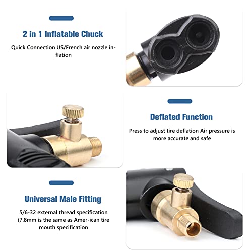Design preciso: connettore universale con filettatura maschio da 7,8 mm, mandrino per pressione dell'aria bloccabile compatibile con valvole per pneumatici standard americane e francesi e punta per pneumatico a sgancio rapido.
