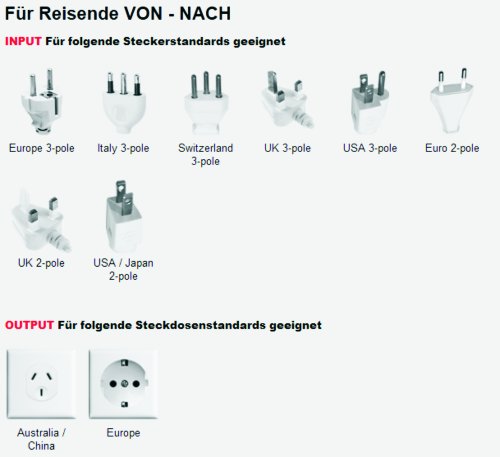 Questa combinazione di adattatore da viaggio è stata prodotta per i rivenditori tedeschi - pensato e progettato in Svizzera.
