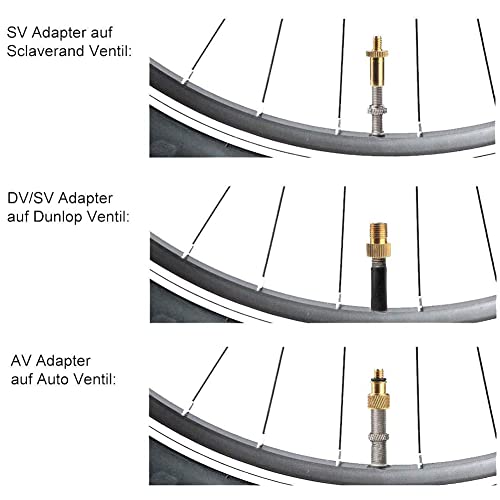 Copre tutti i requisiti: con diversi set di adattatori per pompe per bicicletta è possibile adattare valvole non adatte a pompe ad aria o compressori di stazioni di servizio, per l'uso in compressori per auto, valvole francesi per biciclette (valvola Presta), Schrader, Sclaverand.