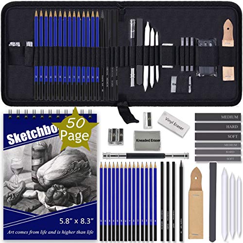 ADAXI Matite da disegno con quaderno per schizzi, 50 pagine, 33 pezzi, set professionale da disegno in custodia con cerniera, kit per schizzi con penna in grafite per adulti e bambini