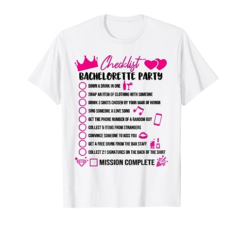 Addio al nubilato checklist gioco ragazze notte fuori sposa divertimento Maglietta