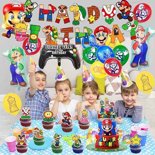 Decorazioni per festa di compleanno di Mario. Il set per feste include 1 striscione di buon compleanno, 13 toppers per torta, 16 palloncini in lattice e 4 palloncini in lamina.
