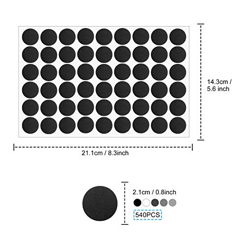 2. [Informazioni sul pacchetto]: La confezione include 10 fogli di copertura autoadesivi per fori a vite. 54 pezzi per foglio, 540 pezzi in totale.