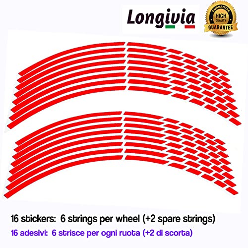 ✔️CONTENUTO: 16 adesivi a strisce per cerchioni di moto, auto, biciclette. Bastano per 2 ruote e rimangono 2 pezzi di ricambio per ruota. Adatte per cerchi da 15” a 19” pollici, che equivale a 38 fino a 48 centimetri. Disponibili nei colori rosso, bianco argento, verde, blu e giallo.