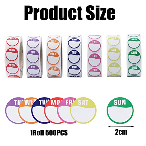 【La confezione include】:Contiene 7 rotoli, ciascuno con 500 etichette, lunedì, martedì, mercoledì, giovedì, venerdì, sabato e domenica, applicabili a tutti i giorni della settimana (totale 3500 etichette).