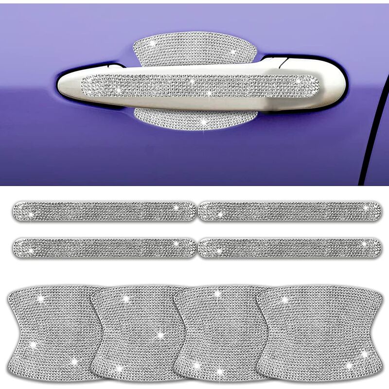 Realizzati con più superfici tagliate e strass ad alta densità, gli scintillanti adesivi per maniglie delle portiere in cristallo daranno un tocco di brillantezza alla tua auto! Questi adesivi possono mostrare diversi effetti lampeggianti sotto luci diverse, facendo risaltare l'auto. Questa protezione antigraffio per la maniglia della porta può essere utilizzata anche come avviso di effetto riflettente notturno per la sicurezza di guida. Viene fornito con 4* adesivi con strass per maniglie della portiera dell'auto e 4* adesivi con strass per ciotole della portiera dell'auto, un oggetto bello e durevole protezione lucida, un adesivo universale per molti tipi di auto. Con pochi semplici passaggi (consigliati fare riferimento alla foto), puoi installare facilmente la protezione del manubrio dell'auto in pochi minuti. Per prima cosa assicurati che la superficie della maniglia dell'auto sia pulita e asciutta, quindi stacca la pellicola protettiva sul retro e attaccala in posizione. Brilla