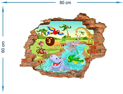 Adesivi Murale per bambini StickerDesign Made in ITALY Adesivo Murale effetto Buco nel muro 3D Animali della savana in un laghetto Giraffa coccodrillo scimmietta Decorativo Cameretta Bambini Fantasy Adesivo Murale Disegni decorativi Wall Stickers decorativo Adesivi Murali Decorazione Cameretta Nursery Carta da parati