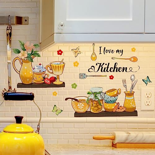 Adesivi Murali Cucina Utensili Adesivi da Parete Tazza, Fiori, Gelato alla Fragola Decorazione Murale Cucina Sala da Pranzo