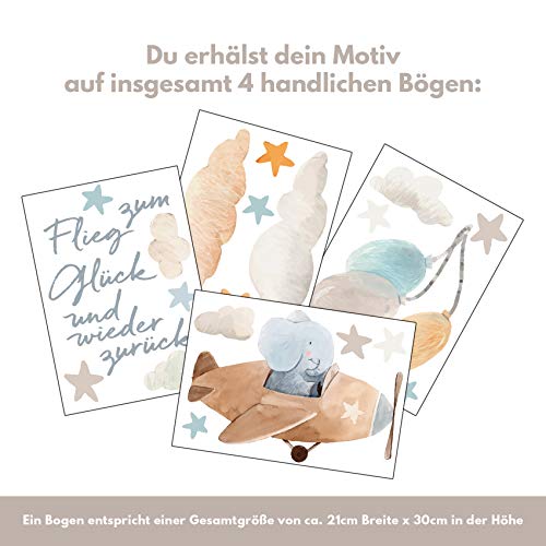 Set di adesivi da parete, con motivo con mongolfiera, su 4 fogli DIN A4 in totale, 150 x 55 cm, per la cameretta dei bambini e dei neonati, in stile ad acquerello, Y057-3 (elefante)