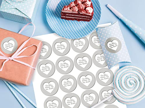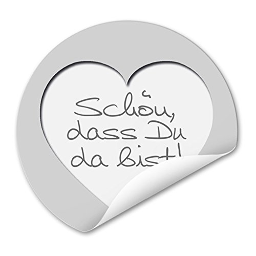 96 adesivi rotondi bianchi grigi argento Shabby con scritta in lingua tedesca "Schön dass du da bist" con scritta in lingua tedesca "Schön dass du da bist", testo 4 cm, etichette adesive per matrimonio, battesimo, nascita, comunione, festa di compleanno, imballaggio, decorazioni per bomboniere