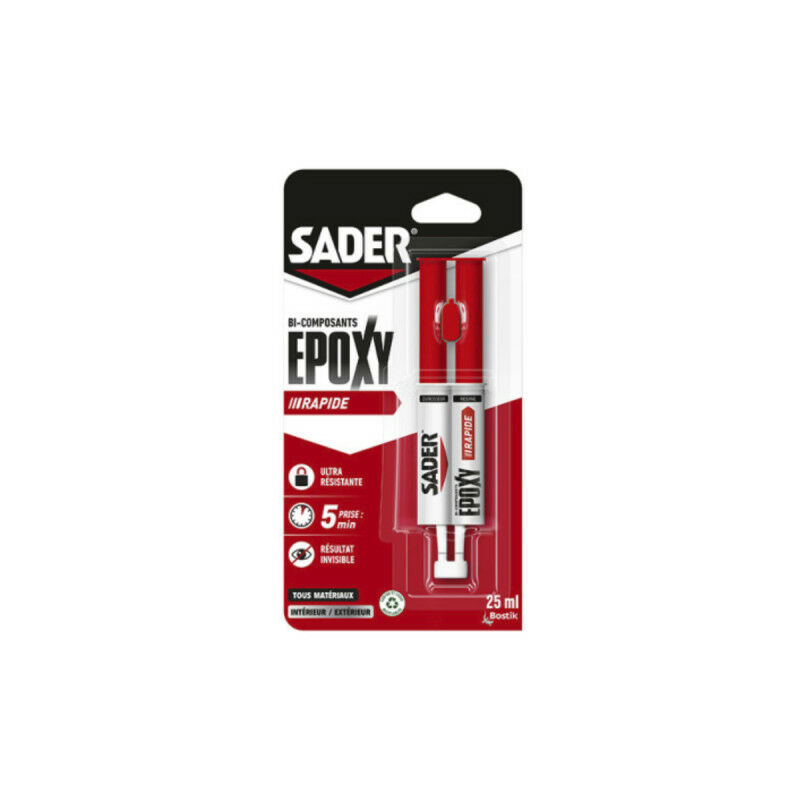 Presentazione: colla epossidica rapida bicomponente SADER in siringa da 25ml, un'adesione rapida in 5 min e ultra-resistente, un pratico imballaggio per pipette per semplificarti la vita. Versatile, consente l'azione su un gran numero di supporti! Vantaggi: Accoppiamento accelerato con una presa di 5 minuti Ultra-resistente nel tempo con una resistenza finale di 130 kg / cm2 Aderisce su molte superfici come legno, metallo, ceramica, vetro, pietra, plastica, legno terracotta (non funziona su superfici in polietilene, polipropilene e teflon) Resiste a temperature estreme da -30 ° C a + 70 ° C Resistente all'umidità Uso per uso esterno e interno Caratteristiche: Capacità: 25ml Resistenza finale: 130 kg / cm2 Attacco: 5 min Prestazioni massime: dopo 2 ore Uso interno ed esterno Conservare in luogo fresco e asciutto Confezione: 1 x adesivo epossidico bicomponente rapido SADER in siringa - 25ml Suggerimenti: rompere la punta Premere il pulsante prendere i due componenti dal contenitore